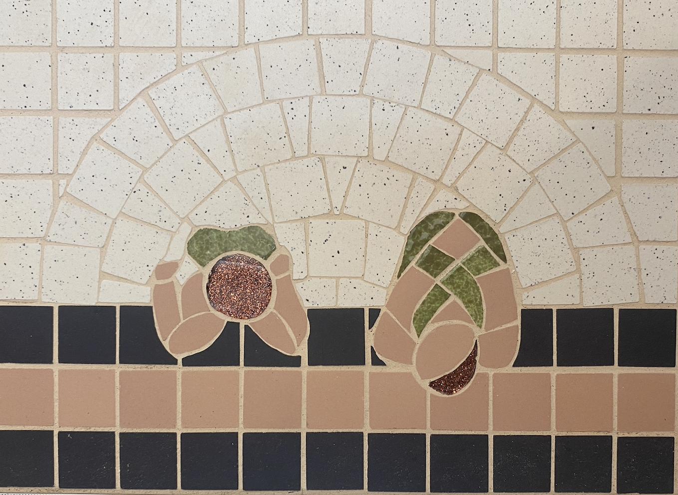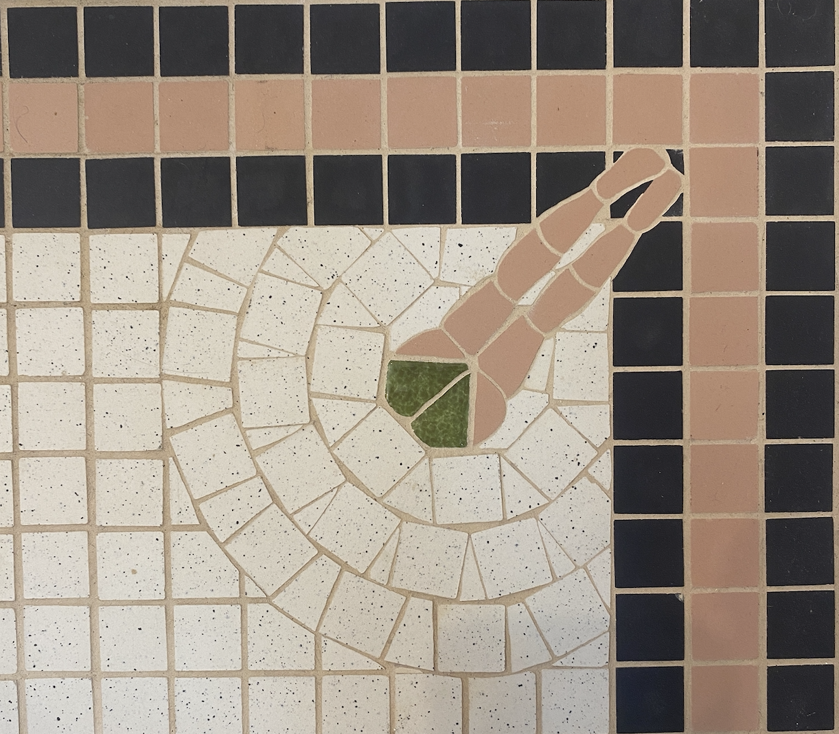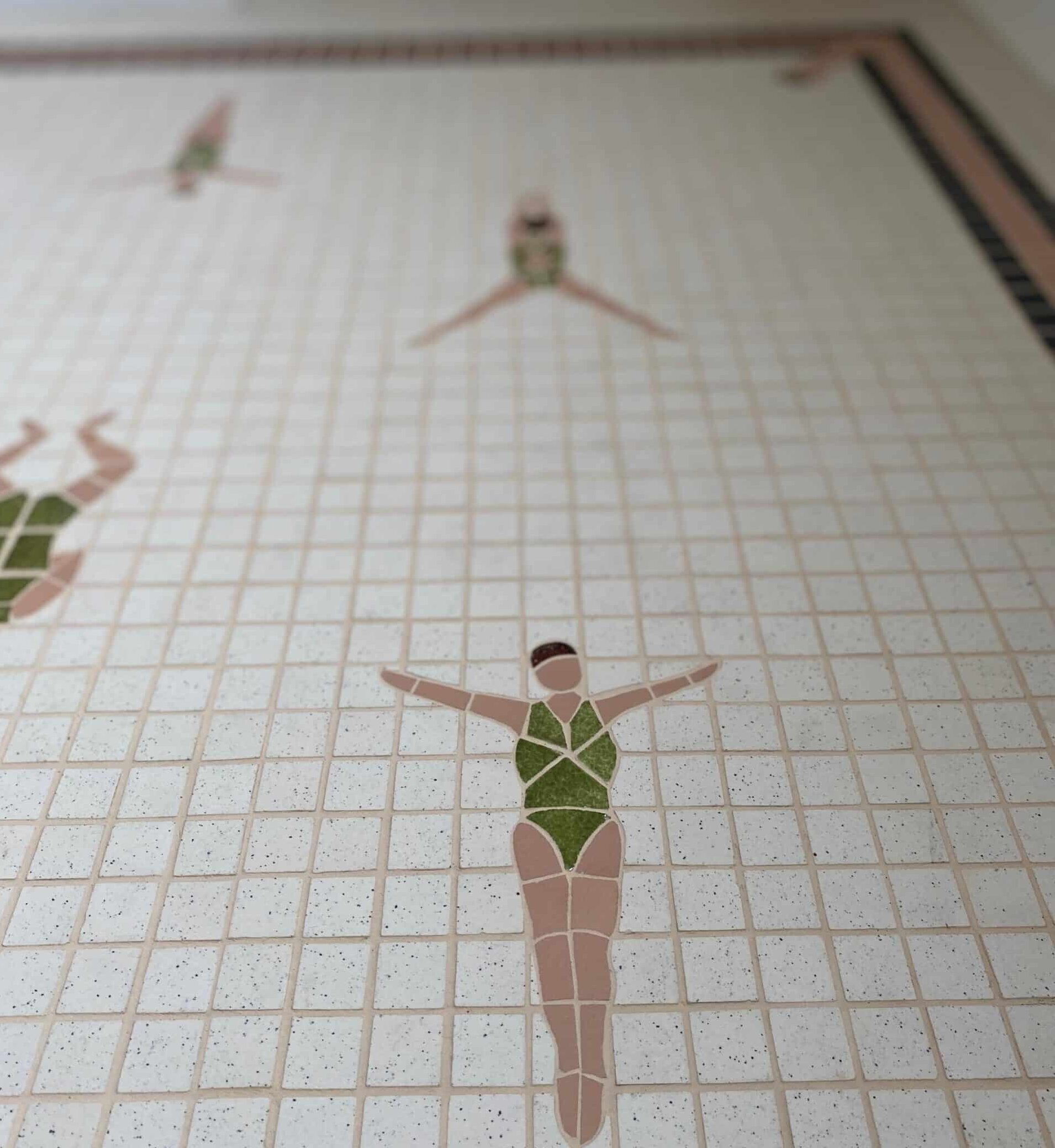 Cette Mosaïque des NAGEUSES (SWIMMERS Tiles) revisite les codes de l’Art Déco à travers des choix audacieux de matériaux, créant contrastes et vibrations visuelles pour donner vie à ces silhouettes graphiques. Chaque détail a été soigneusement travaillé, notamment les petits bonnets à paillettes, véritables signatures de ces NAGEUSES.