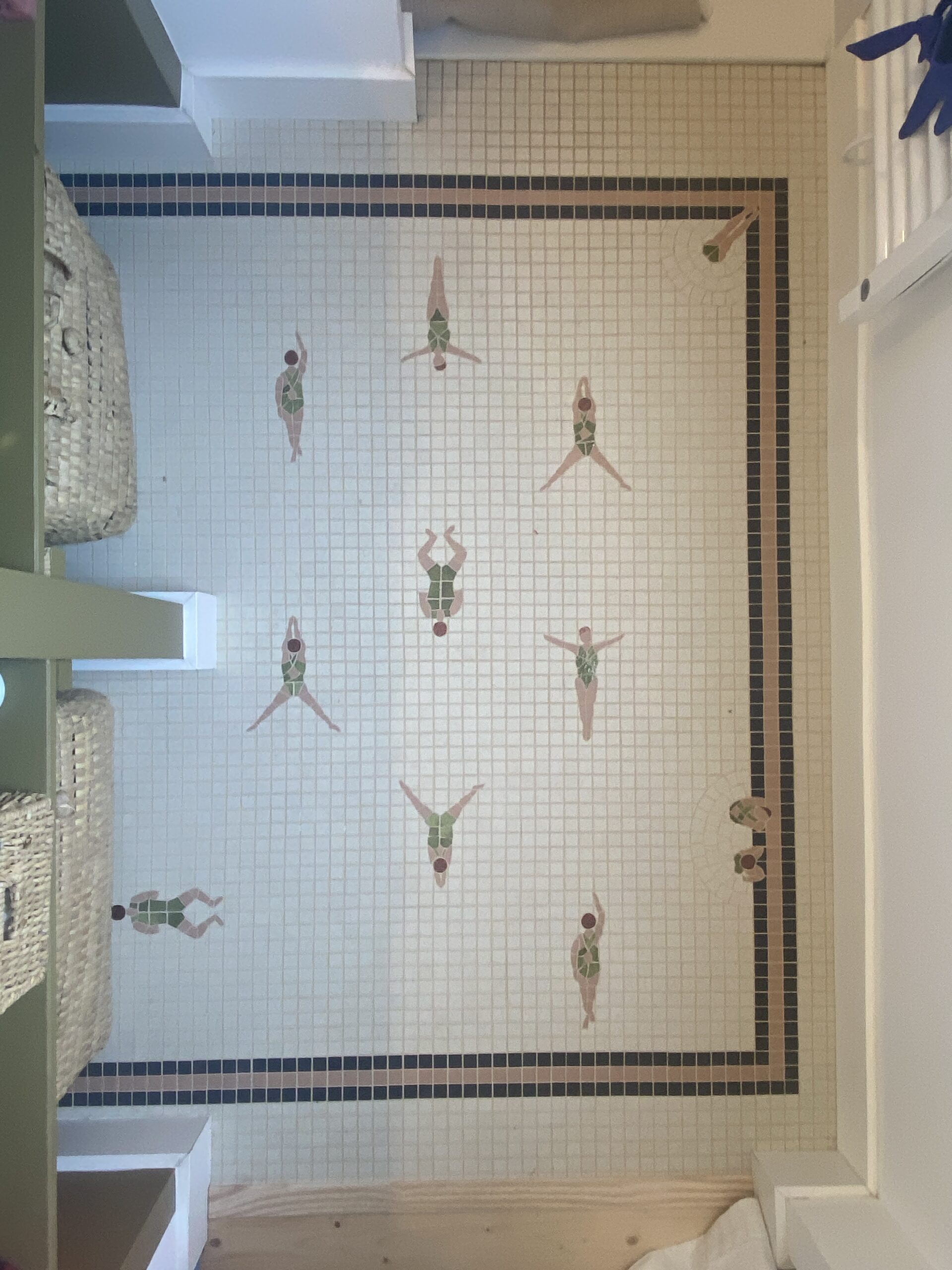 La Mosaïque des NAGEUSES, est une co-création sur mesure imaginée par MAUD’S ARCHI pour sa salle de bain personnelle. Inspirée par la mythique piscine Molitor et par l’esthétique des BAIGNEUSES des années 30, cette mosaïque trouve son origine dans un parcours de design nourri par l’univers Art Déco.